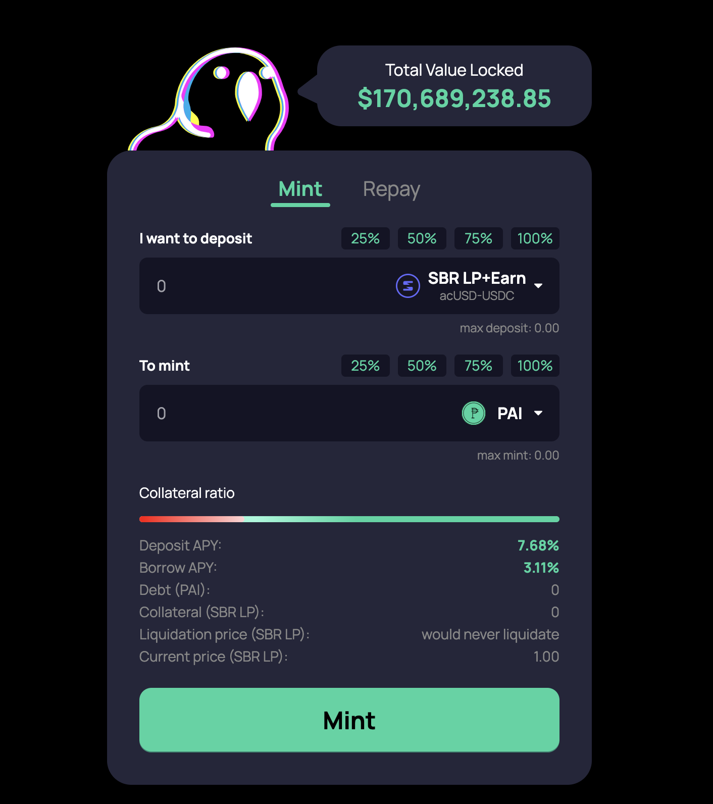 To acquire the PAI stablecoin, deposit collateral on Parrot. Note that the risks associated with this strategy are liquidation of collateral if it drops below a given percentage of the PAI debt, and the possibility of PAI losing its peg.